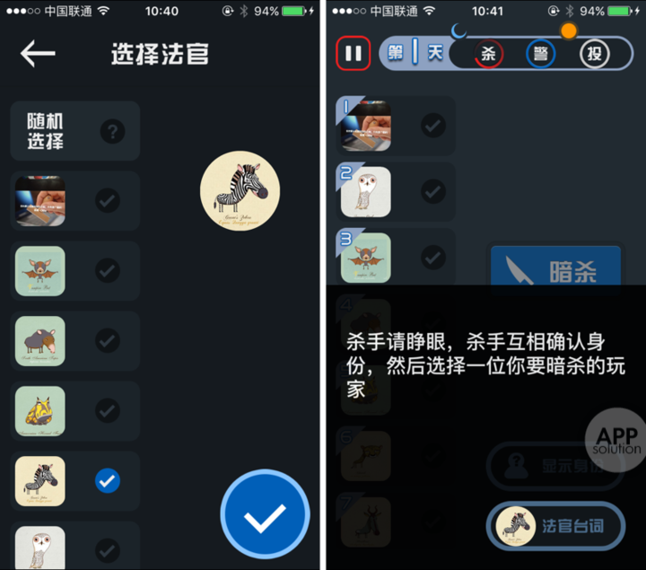 相比「聚会玩」种类繁多的游戏,「我是杀手」则单纯得多。这是一款专注于杀人游戏的应用,界面精美、音效刺激、步骤详略得当。无论你是资深玩家还是入门菜鸟,它都是你玩杀人游戏的不二之选。