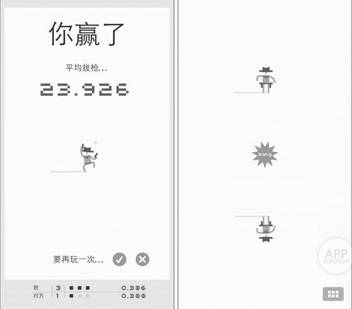 这是一款简单粗暴的游戏,游戏名字可以窥视到玩法:「Ready」、「Steady」 是等待读数,当听到枪声或者看到「Bang」的符号出现,触摸属于自己一侧的屏幕任意位置即可扣动扳机,进行生死决斗,不过如果触屏太快将无法击中目标。