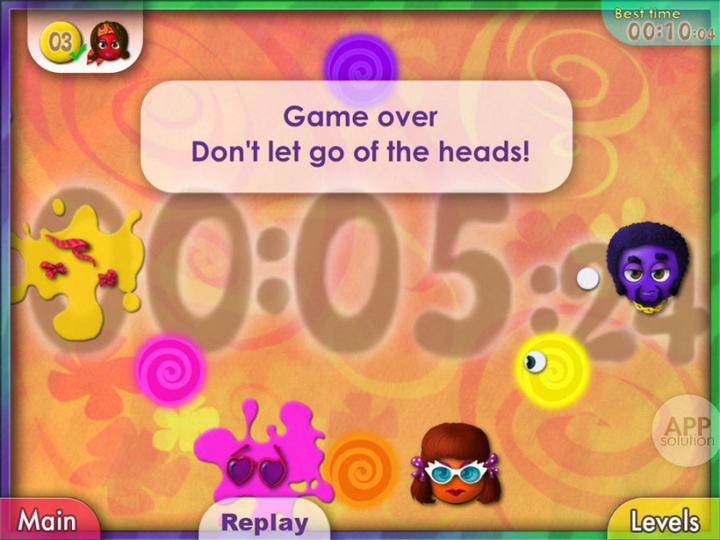 之所以会让人笑开怀,可要归功于失败后的惨局:当你的手指按压住某张脸后,该脸会立马变得很怨念,而一旦手指离开此脸超过三秒钟,它会吧唧地滩作一汪扭曲的水。而随着游戏的难度逐渐增加,你和你的小伙伴会发现手指们立马便呈现出「不够用」或者「纠缠打架」的局面。而破解难题得需要你们旋转、互相协作并「换脸」才行。