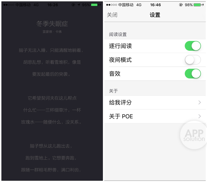 轻阅读也需要照顾到位,poe 还支持「逐行阅读」、「夜间模式」和「音效开关」的选项;除此之外,应用只剩下诗意的流露,还有用户的心境。