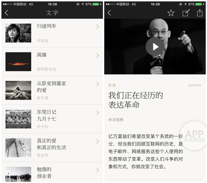「单读」强调文体,强调语言。应用界面简约富有中国报章风格,浏览「单读」能找到较于纸质阅读的另一番滋味。排版、字体、配乐等等都有讲究,形式上也能做到耐读。每一篇文章都会标注作者介绍和版权说明,支持用户互动功能。