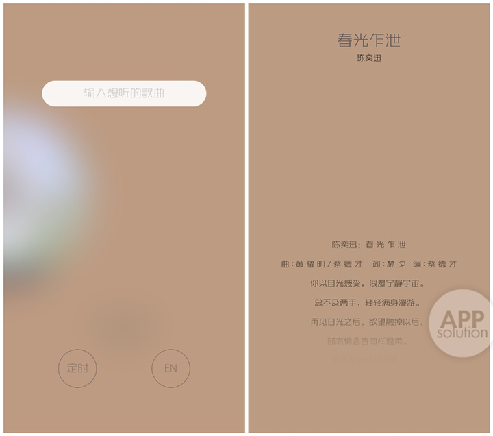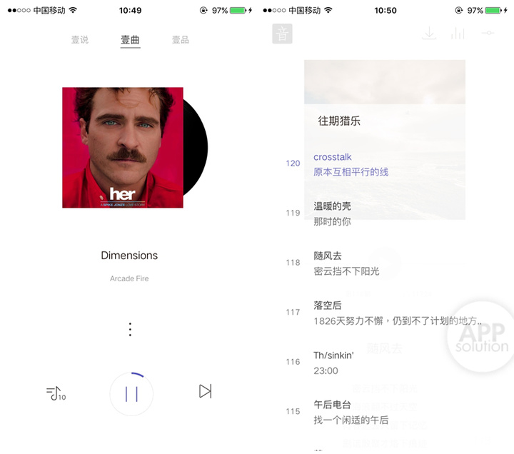 应用保持简约干净的设计风格,二层菜单展示也只是半透明的方式。 每个一段时间会更新一期「猎乐」。每一期猎乐都会有主题和配言,每一首音乐都是各有风格特色,更多的是小众的独立音乐。