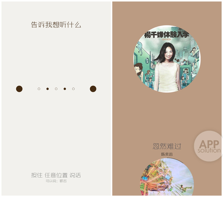 界面操作采用简便的交互方式,在专辑封面处,点击、滑动和长按即可完成一系列歌曲的暂停和切换。点击专辑封面进行歌词显示,向左滑动暂停播放歌曲,下滑切换下一首歌曲,上滑可分享到社交平台,空白处长按便可重新语音搜索歌曲——一系列的手势操作流畅自然,没有歌曲切换的滞后感,即滑即换。