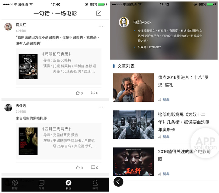 首页推荐的也许是更多电影中的经典或者最近热门的大片,那「发现」更多是电影的短评,一针见血地让电影发烧友发现更多奇珍异宝。而这些所有的电影推荐,每位热爱电影的用户都可以参与其中,与广大影迷交流心得