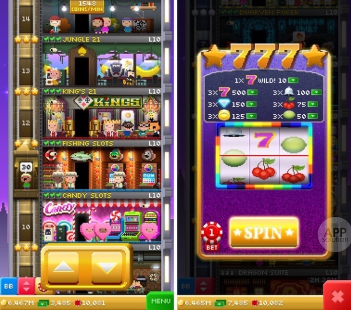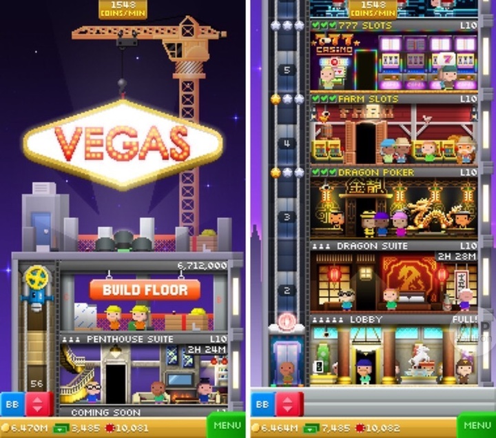 Tiny Tower Vegas 适用于 iOS 7.0+ 的 iPhone 和 iPad 及 Android 2.3.3+ 的设备,iOS 版 55.3 MB,Android 版 33 MB,免费有内购。