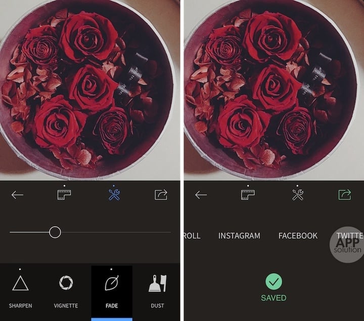 待调校满意后,通过 RNI Flims 你可以将照片保存至本地或者在 Instagram、Facebook、Twitter 上分享。