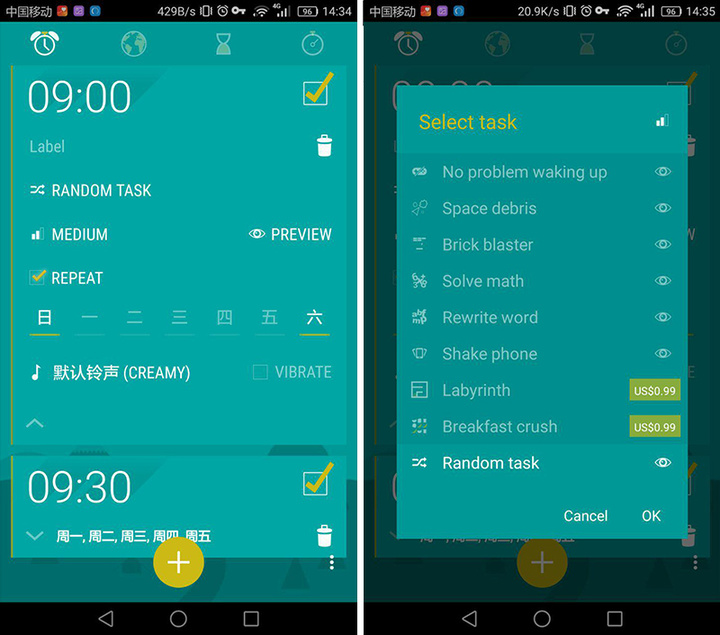 App 内置了很多不同的小游戏,同时还有三档难度可以选择,当然,这其中的几款游戏是需要付费的。你也可以选择 Random 模式,也就是闹钟想的时候随机选择一个游戏。