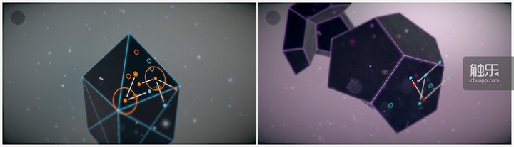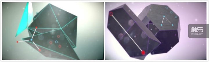 除了拖动和划屏之外,玩家还可以同时使用两指旋转线条图案,因为有些关卡需要旋转才能把图案放到正确的位置。当该关卡结束,几何形状就会发生不可思议的变化,每一个被玩家所正确摆放线条的面都发出柔和的光芒,幽幽的投射在宇宙中。