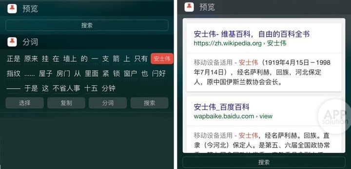 比如复制微信聊天记录时,我们只能复制整个气泡中的内容。这时如果想要搜索其中的某些关键词,除非在搜索栏中手动输入,之前我们必须执行多次复制粘贴,最终才能完成搜索;而如今我们只需下拉通知中心,在分词部件中接连选取关键词,复制之后便能在预览部件中迅速查看到搜索结果。