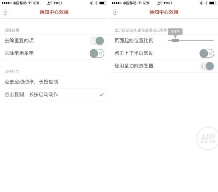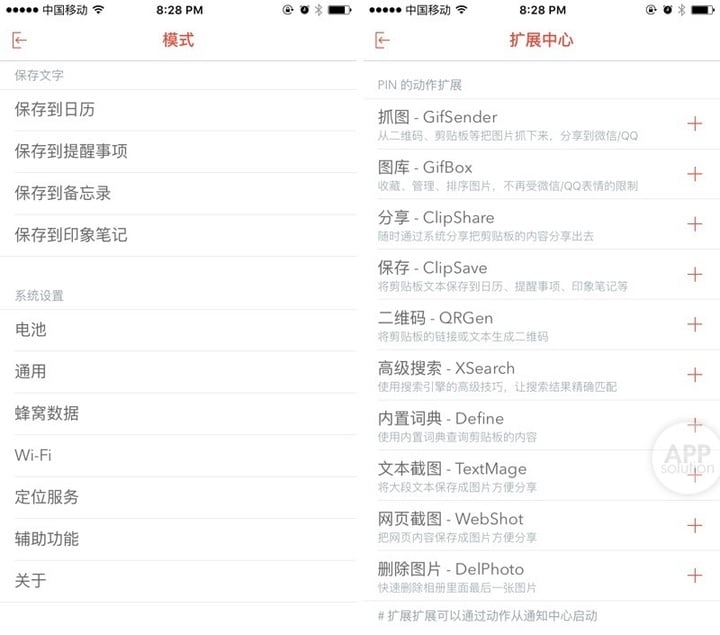 前者将剪贴板中的文字分解为多个一字或二字词语,我们可以从中选取词语来执行复制及搜索的操作。后者则相当于在通知中心植入了一个浏览器,并提供了自定义搜索引擎的选项。