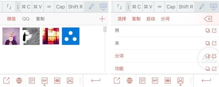与通知中心相比,键盘「选择即粘贴」的特性使其更适用于在输入时调用剪贴板的场景,相反在键盘中执行动作则显得繁琐无比。因此我在通知中心中仅保留了动作部分,而分词、剪贴板记录都尽量挪至键盘中完成。不过这样安排的建议仅供参考,最合适的布局定是因人而异的。