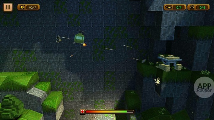 Mission 14,我的任务是深入地下洞穴找到被偷走的坦克。首先不说为啥地下洞穴要直升飞机去救援,我就很好奇那个坦克是怎么进去的。好啦,开始的时候我们选好飞机,带上加特林机关枪,同时按下屏幕两侧直升机垂直升空。升空之后按屏幕左右两侧调整直升机的飞行角度和路径,这一切都是极好的。