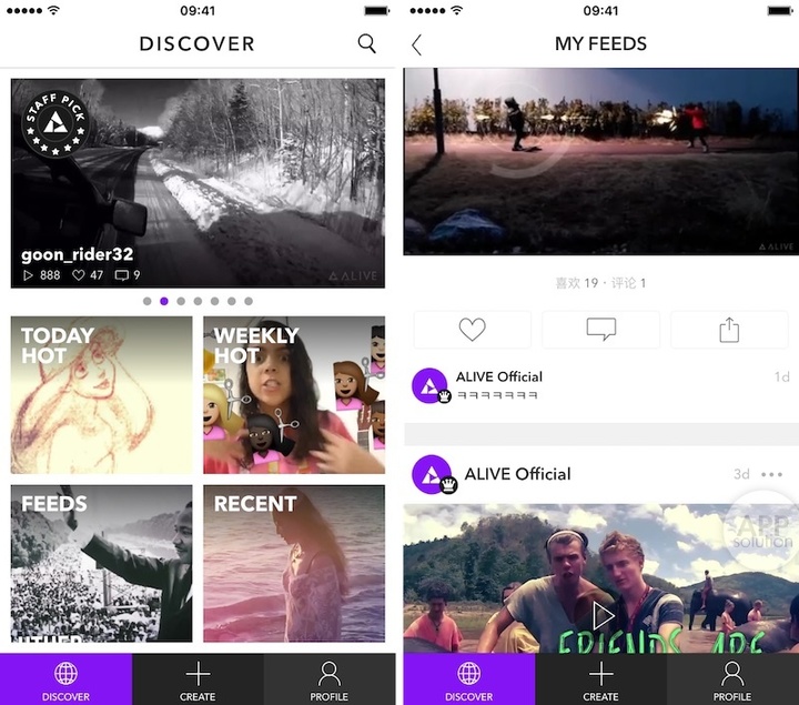 待视频上传成功后,你就有了在 ALIVE 的视频,还可以将它分享到更多媒体和平台上。除了自己制作视频,你还可以在 ALIVE 的发现频道中观看其他用户的视频作品,不得不说这些人真会玩。