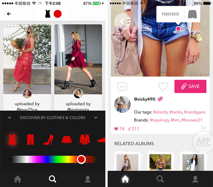 除了可以根据不同颜色筛选单品外,还能依牌子、潮流、印花、风格、季节等分类筛选,遇到喜欢的博主还能关注并保存,图片上还有衣服信息。