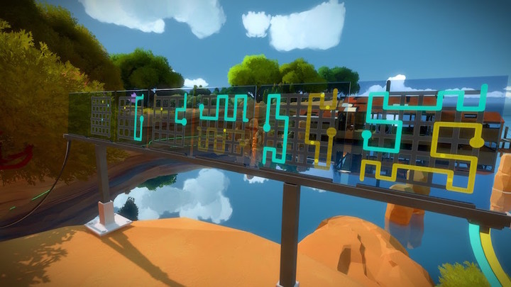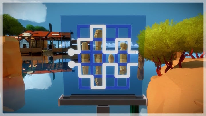 这是「The Witness (见证者)」谜题的另外一个惊人之处,那就是他不是局限在棋盘上,你必须搭配四周的景物、建筑、光影、水面,组合起来构成真正可以解出来的谜底。