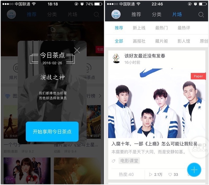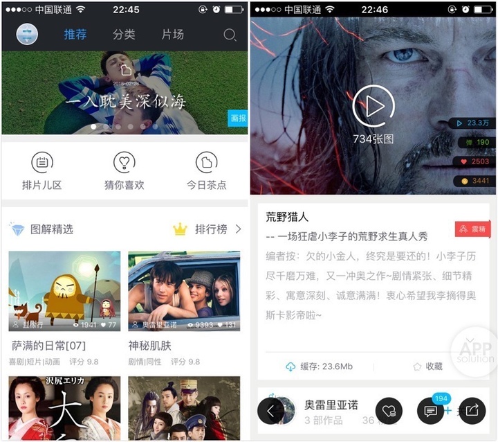 你能在里面找到最新流出的小鲜肉、依旧经典的老腊肠以及时下人气最高的日剧美剧。在「首页」,图解电影的运营组(他们自称为「鞭基部」)会每天在早读-午休-晚自习-宵夜四个时段,为你推荐适合你的内容。除此之外,「分类」提供了时间、地域、类型等各选项,分类精准,能瞬间打消掉你挑选图解时的迷茫。