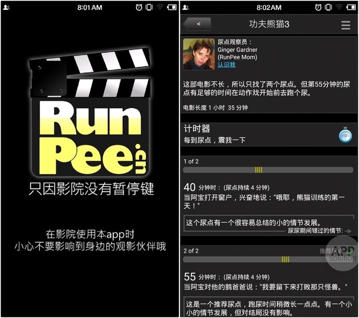 这是一款能够让你知道最佳尿点的应用,同时你还可以在里面看到自己在嘘嘘期间错过了什么情节、影片结尾是否有彩蛋等。如果是 3D 影片,你还能参与投票或是参考大家的投票,某部影片究竟是不是值得看 3D。里面设置了尿点的震动计时器,可以通过「计时器设置」来调整震动的频率。震动计时器刚刚启动时会震动 1 秒,表示已经开始。