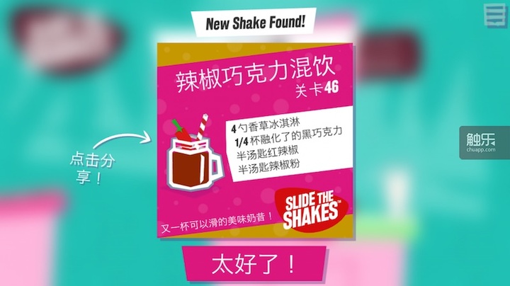 Luke 对游戏细节有着近乎苛刻的要求。在新游戏《滑动奶昔》中,每种饮料解锁时都会出现其配方,数据精准到 1/4 勺的量度。他们为此用问卷统计了数百人最喜欢的饮料,然后去饮料店试喝,并向店主要到配方,放在游戏中。
