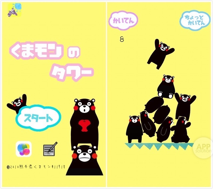 此作是人气应用 どうぶつタワー (动物塔)的姐妹篇。简单来说,游戏需要你在熊本熊叠罗汉的过程中让他们保持平衡而不掉下去。你可以点击「かいてん」对熊本熊进行 90 度旋转或点击「ちょっとかいてん」对其进行 30 度旋转。