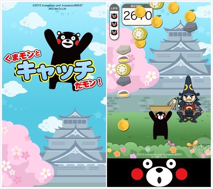 くまモンとキャッチだモン (抓住熊本熊)适用于 iOS 4.3+ 的 iPhone、iPad 及 Android 4.0+ 的设备,iOS 版 16 MB,Android 版 2.4 MB,完全免费。