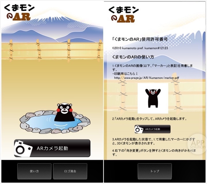 くまモンのAR (熊本熊 AR)适用于 iOS 5.0+ 的 iPhone 和 iPad 及 Android 2.3.3+ 的设备,iOS 版 17.7 MB,Android 版 22 MB,完全免费。