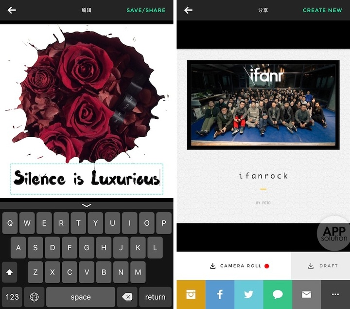 加框完成后可以保存至草稿箱和本地,也可以分享至 Instagram、Facebook、Twitter 等社交平台,并能够以短信和邮件的形式发送给朋友。当然,拷贝至云盘和 IM 工具也是可以的。