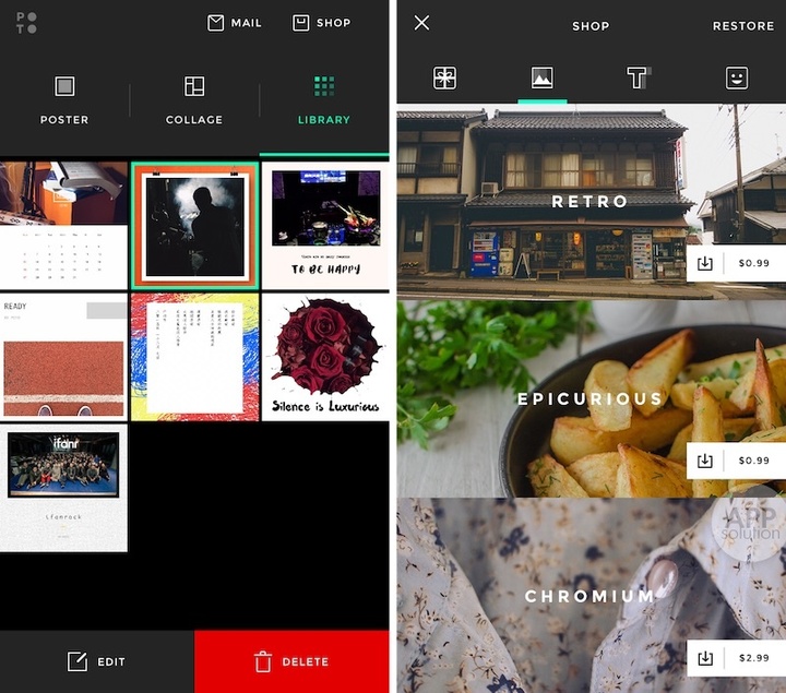 你可以在 LIBRARY 中看到处理完毕的照片,有点像一个私人小画展。Poto 靠 IPA 盈利,提供相框、字体和贴图等内购项目,质量上佳。
