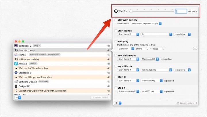 你可以在 Startupizer 里对一个应用程序做启动条件的规则设定。看下图,我可以让应用程序在接入电源后自动启动,也可以在接入一个特定 Wi-Fi 网络时自动启动 iTunes,规定应用程序在某个特定时间段内启动,规定应用程序在某个分区启动后才开始运行,或是设定一个功能键,在开机时按住这个功能键才能启动程序。