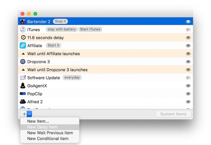 除了在对程序启动的条件上进行设定之外,你还能掌控所有开机项的启动顺序(下图),在窗口左下角点击下拉菜单按钮,你可以在这里做: