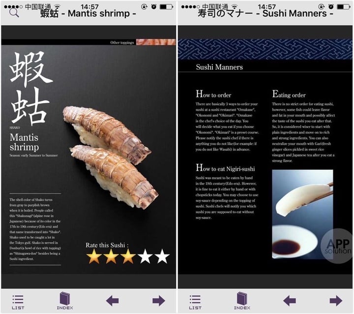 应用详细介绍了各种配料的寿司,你也可以给每一种寿司进行打分。此外,应用还专门介绍了寿司的食用规范以及寿司餐厅的专业术语。