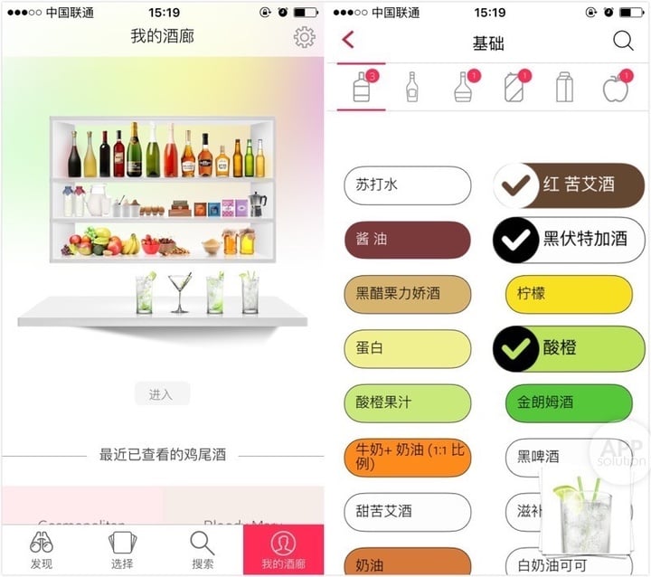 此外,在「我的酒廊」里可以根据你现有的基酒、配料告诉你能调哪些鸡尾酒,非常适合材料不全的初级调酒爱好者。