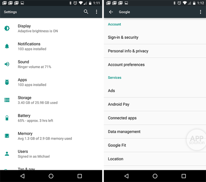 与此同时,「声音」和「通知」的选项也被拆分开。而 Google 也成为了系统设置中专属的一项,在里面可以进行 Google 账户和 Android Pay 的设置。