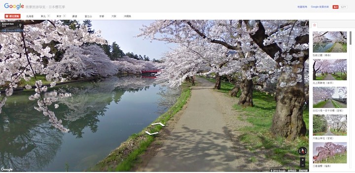 台湾游客最喜爱的出国景点之一:日本樱花季,在 Google 街景中甚至有专门的网站,收罗日本各地的樱花盛开街景,让你在樱花树下实地游览,就算你亲身到日本,也还不一定有办法算准时间,看到这么盛开的樱花风景呢!