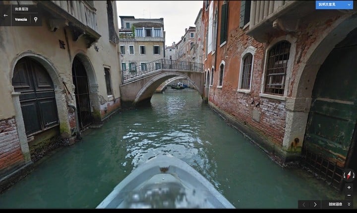 Google 街景在威尼斯有非常完整细致的拍摄成果,不仅威尼斯的大街小巷都有街景穿梭,甚至连著名的威尼斯运河水道也都能让你搭乘小艇游览,跟河道上的贡多拉船擦身而过。
