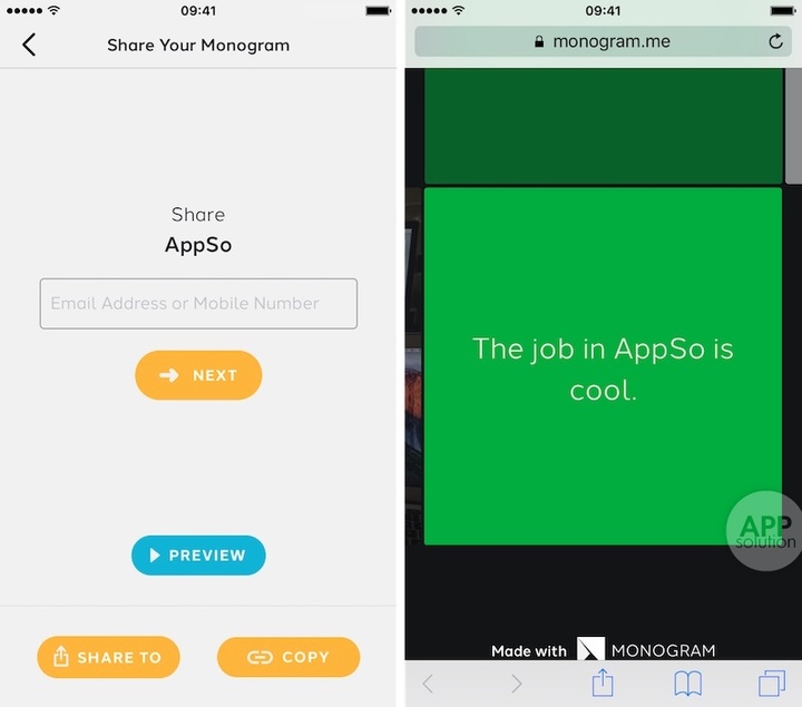 你可以将介绍分享给指定的邮箱和手机,或者拷贝链接以其他方式分享,这需要你完成 Monogram 的注册。对方将会在一个网页中查看到你的自我介绍,虽说这与自己制作网页相比少了自由发挥的空间,但同样具备观赏性和应有的信息量。