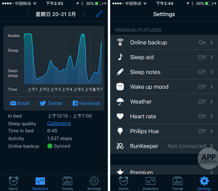 和 Sleep Cycle 一样,Pillow 也是一款睡眠监测工具。它在趋势的数据记录上虽然没有 Sleep Cycle 全面,但它的数据图表设计的颜值也颇高,并且同样具备睡眠质量记录及自动唤醒功能。