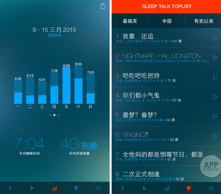 最逗趣的是,你还能上传自己的梦话和别人分享。在 Sleep Talk Recorder 里有一个「Sleep Talk Toplist」,用户会上传自己的梦话,依据投票数进行排名,在这里你能听到来自世界各地的、令人捧腹大笑的梦话。