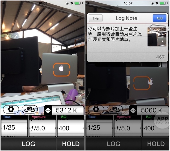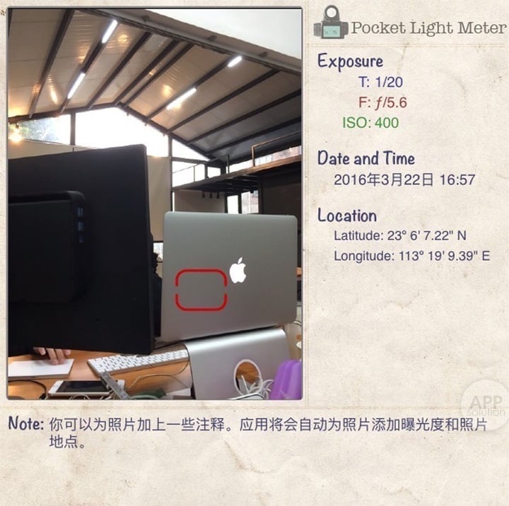 应用的工作原理十分简单,通过手机背后摄像头进行测光,计算出拍摄时所需的感光度、快门速度和光圈数值。使用时,你可以用通过触摸屏移动画面中的橙框,选择合适的测光点,进行测光计算。