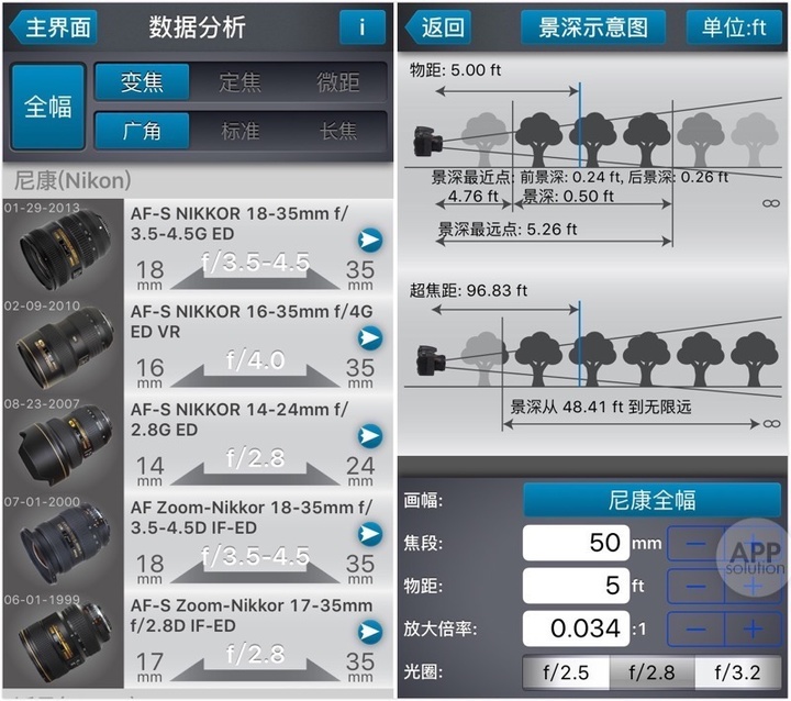 你还可以对比不同的镜头,查看镜头在不同焦段和光圈的差别, 但免费版的仅能对比两个镜头。同时提供了多个摄影常用计算器:景深和超焦距计算,视野计算,视角计算,倍率计算和弥散圈直径计算。 佳能党也有相应的「佳能助手」可以下载。
