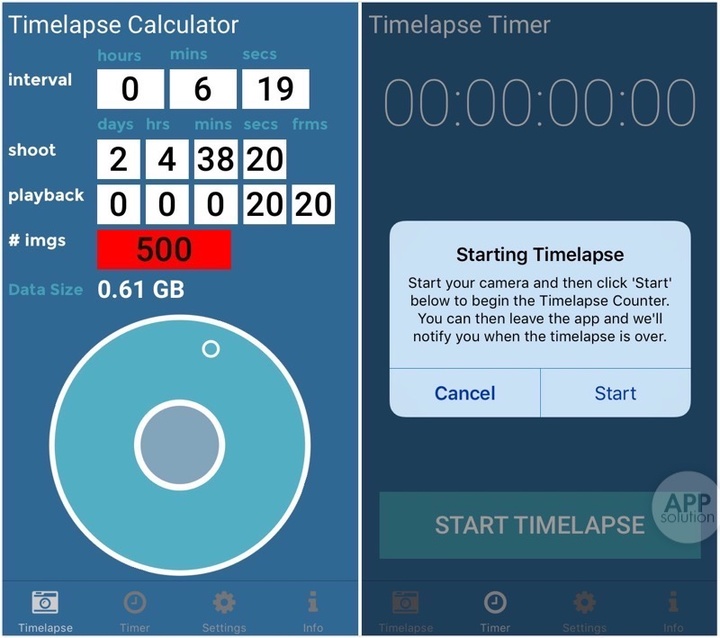 在这个应用中,延时拍摄者只需要输入一些数值,就能知道自己的延时需要播放多久,拍摄所需时长是多少,照片占用空间大概多大(应用基于 Canon 5D Mark III 的照片画质大小给出了参考)。你也不需要再盯着相机看时间,内置的计时器将一直保持在后台,延时拍摄完成后将会提醒你。