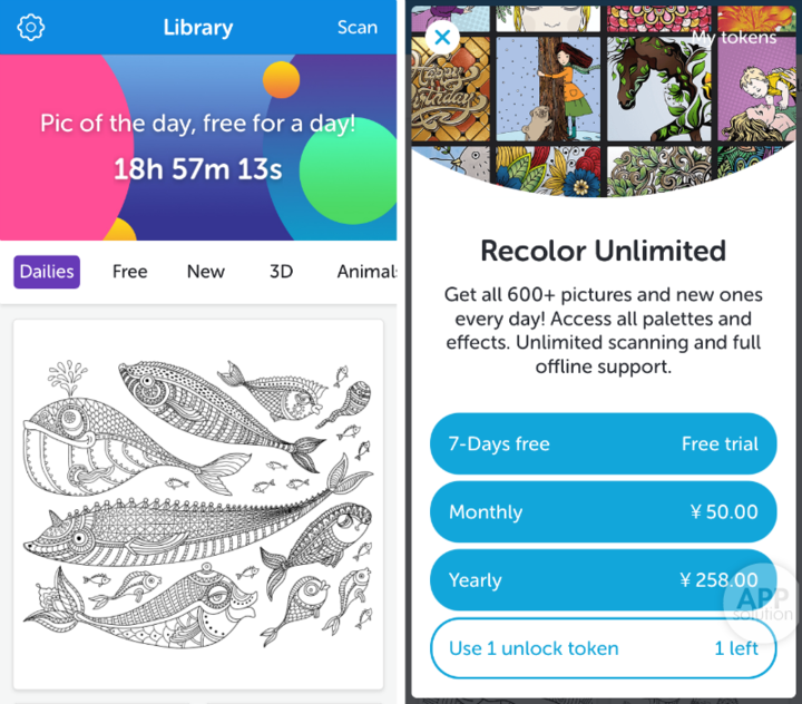 打开 Recolor,迎面而来有一个倒计时。在倒计时完结前,假若你能完成列表内任意一张图的填色,就可以免费解锁 Recolor 中所有的图画一天。你还可以通过购买解锁全部功能:一个月 50 元,一年 258 元。