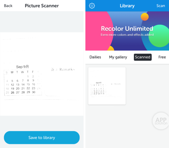 最好玩的是,Recolor 的左上角有一个扫描的功能,你能扫描自己的填色书图案到手机进行填色。因为手边没有填色书,我就拿了只有黑白线条的笔记本代替,亲测能在上面填色,但是因为没有闭合图形,效果不理想。扫描后的图案能在「Scanned」选项中找到。