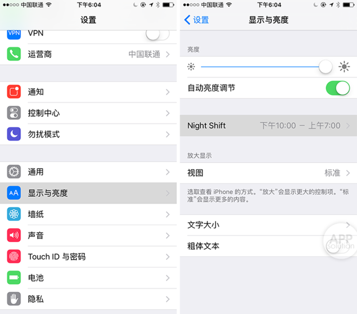 当系统一切就绪,在「设置」-「显示与亮度」中,你能找到「Night Shift」这一项。