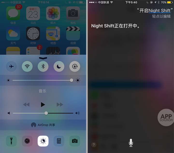 这里补充两点小技巧:第一,在屏幕底部上滑呼出的控制中心,支持一键开启;第二,当设备处于「低电量模式」时,Night Shift 是无法开启的,但你能通过 Siri 让它跳过检测直接开启。