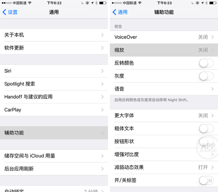 首先,打开「设置」-「通用」-「辅助功能」-「缩放」界面。