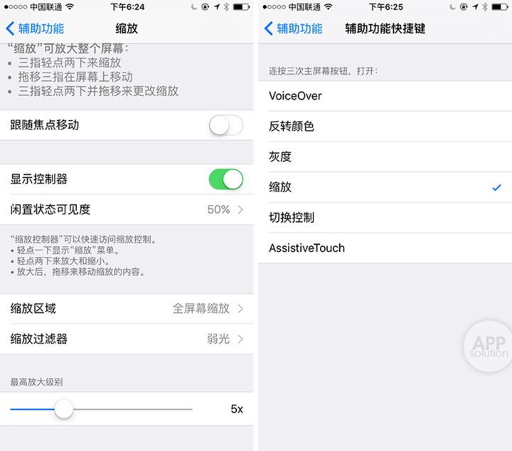 开启「显示控制器」并在下方选择「全屏幕缩放」和「弱光」,之后退回上一级「辅助功能」页面,滑动到最底部选择「辅助功能快捷键」,选择「缩放」选项。