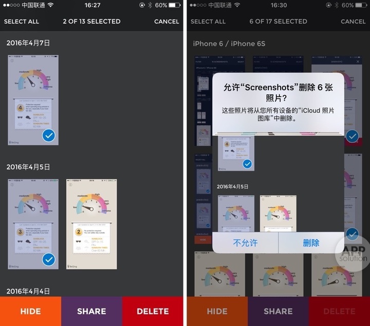Screenshots 支持单个或批量隐藏、分享或删除相册中的截图。所有截图的数量和被选中截图的数量都能实时显示,便于在操作前确认。