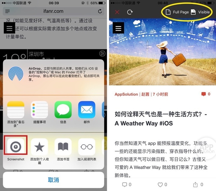 不仅如此,你还可以在 Safari 的分享按钮中添加 Screenshot,无需打开应用本身,即可在浏览网页时选择截取整个页面或当前视图。