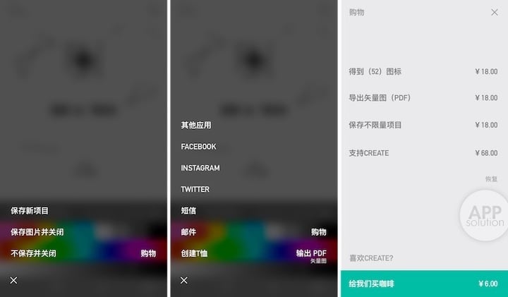 完成后的项目可以以项目形式保存在 Create 中,也可以以图片格式保存至本地相册。输出 PDF 矢量图作为最终呈现的效果图是一个不错的选择,当然这是付费功能。