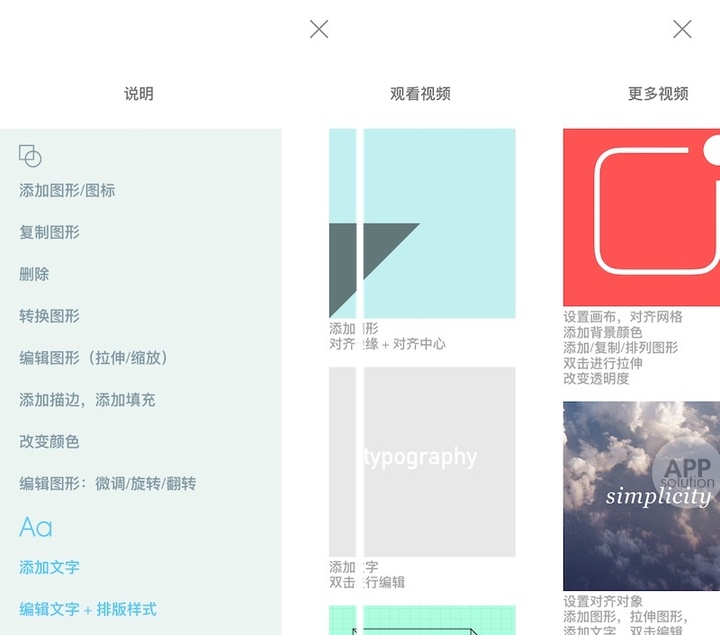 Create 有着出色而全面的用户引导,从功能说明到单一设计需求实现的视频教程,它都一一罗列出来。截图呈现的只是引导内容的一小部分,通过对更多说明和视频教程进行实际体验,你才能体会其全面性。